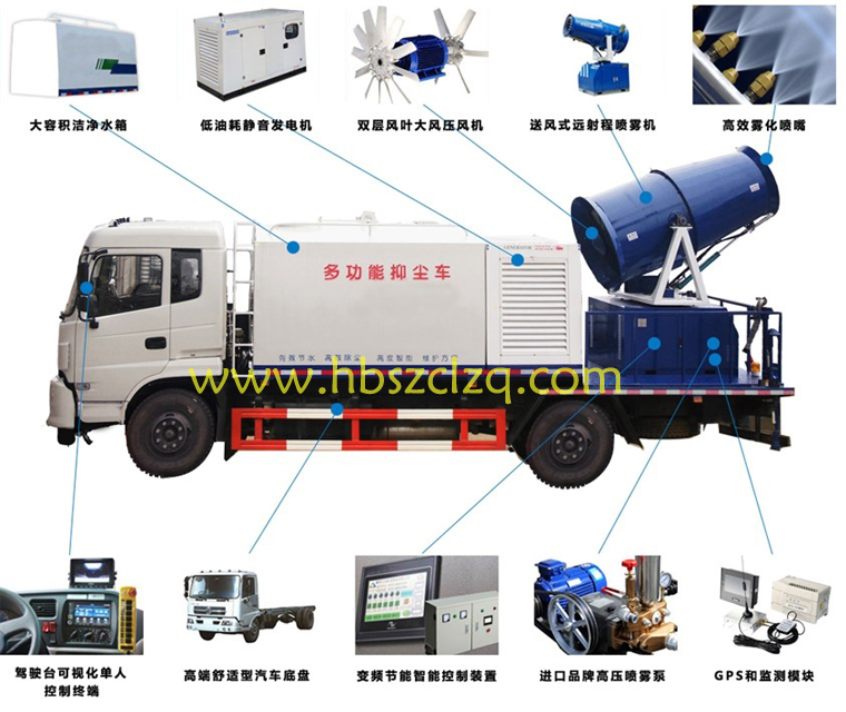 罐体材质为厚4mm武钢优质板材,洒水泵,洒水高炮,工作平台,取力器,前冲,后洒,万向嘴,自流阀,滤网,分配阀,喷头,带自吸自排功能。 |