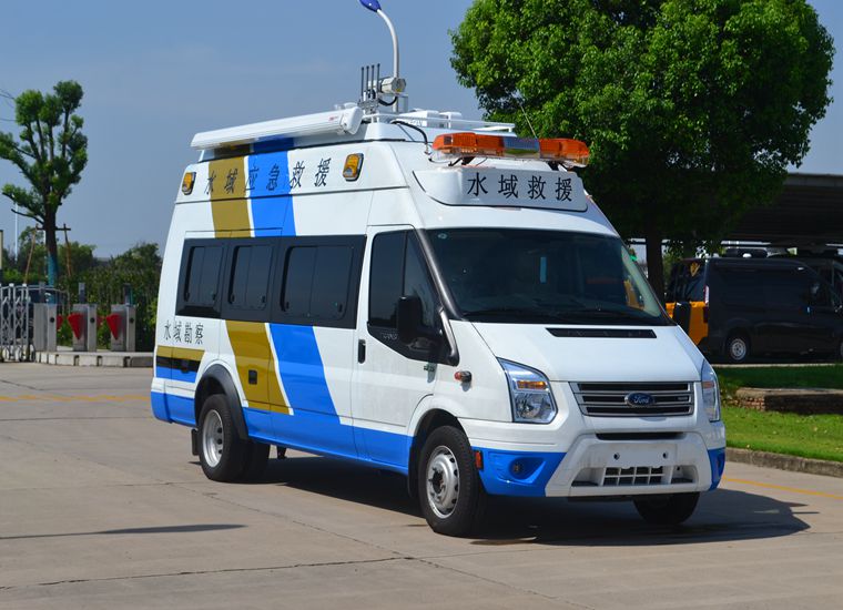 采用江铃新世代全顺加长轴高顶客车改装,配备了水下救援设备、图像采集系统、配电系统、专网通信、指挥系统、照明系统等,主要用于水域现场勘察、营救落水人员等。